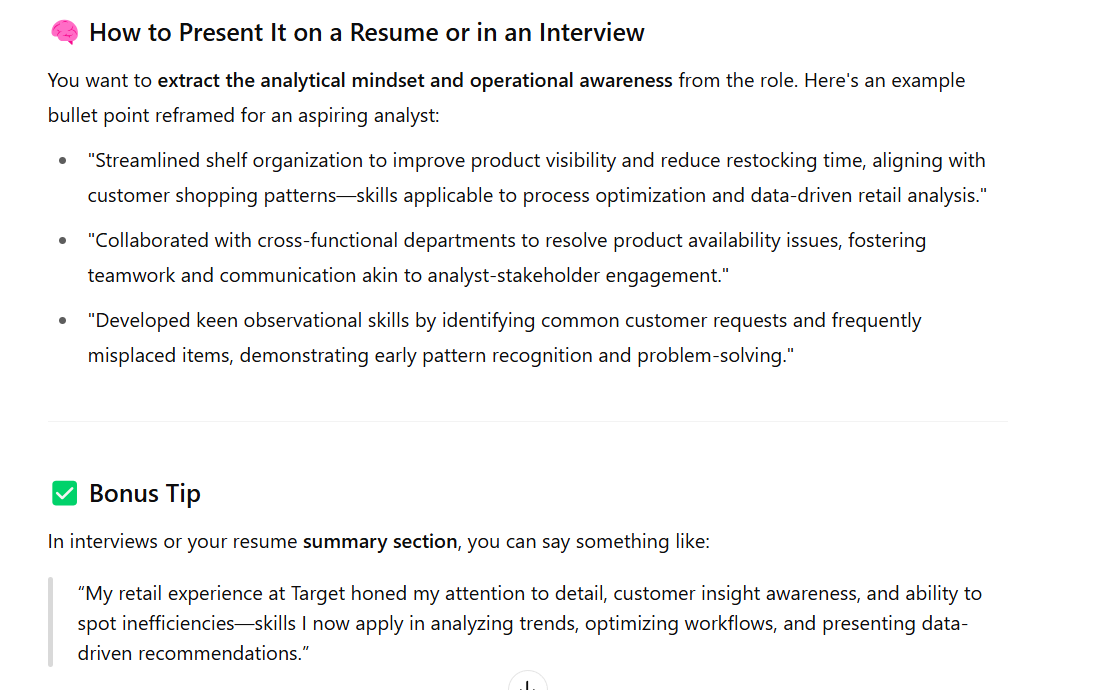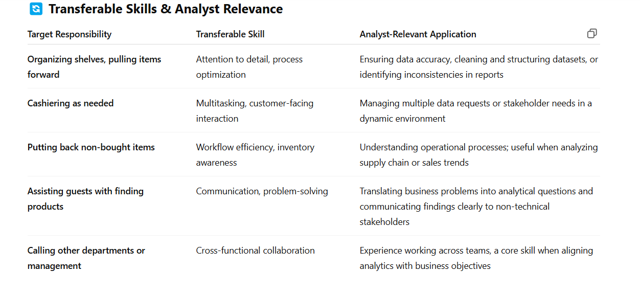 Your experience as a Seasonal Sales Floor team member at Target may not seem directly related to data or business analysis at first glance, but several core transferable skills can be aligned with those roles. Here’s how to frame your responsibilities and connect them to analyst-relevant skills: