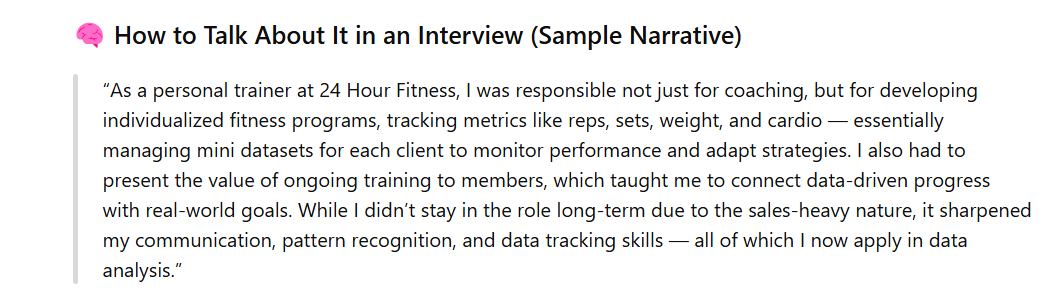 Considering that my master’s degree was in exercise science, there is that possibility I may have to fall back on to finding a job at a gym until I finally do land my analytics role. One things this response highlights as that personal training can involve a lot of tracking of fitness metrics which translates well into data analytics. Especially if one has a lot of clients, it can turn into a huge dataset. The results of keeping track of various metrics can help to determine which exercises are best given a person’s goals, age, health, and other factors. One can discover that maybe certain exercises are more conducive to helping someone run a faster 5k along with a structured running schedule. Then there is the interpersonal aspect of training to find out things such as stress, diet, and other information the client gives could be positively or negatively impacting gains.